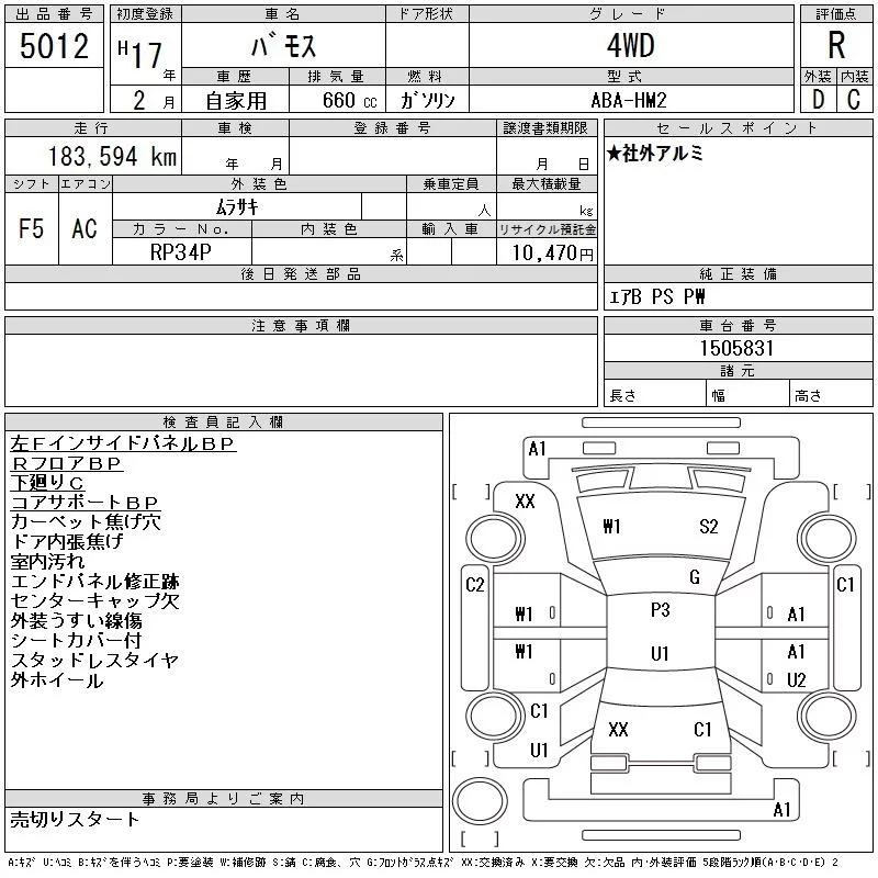 Honda VAMOS с аукциона Японии CAA Tohoku лот № 5012