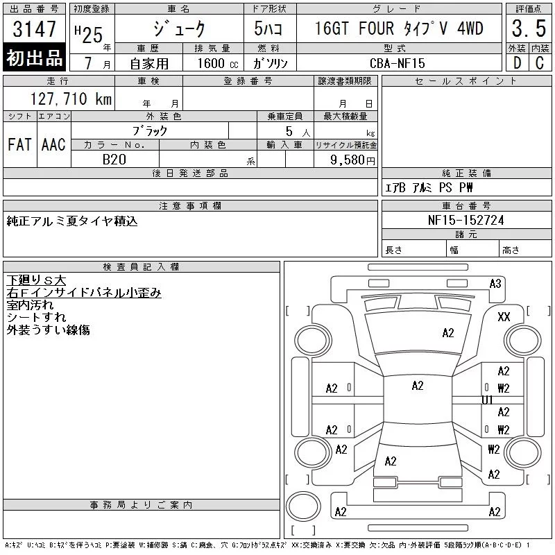 Nissan JUKE с аукциона Японии CAA Tohoku лот № 3147