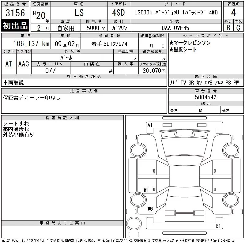 Lexus LS с аукциона Японии CAA Tohoku лот № 3156
