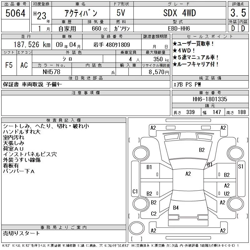 Honda ACTY VAN с аукциона Японии CAA Tohoku лот № 5064