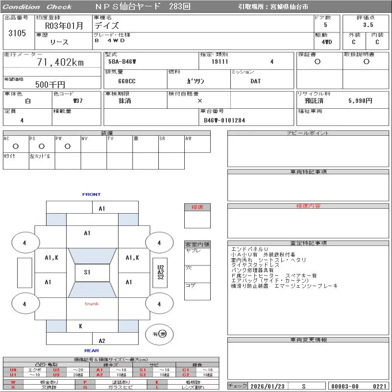 Nissan DAYZ с аукциона Японии NPS Sendai Nyusatsu лот № 3105
