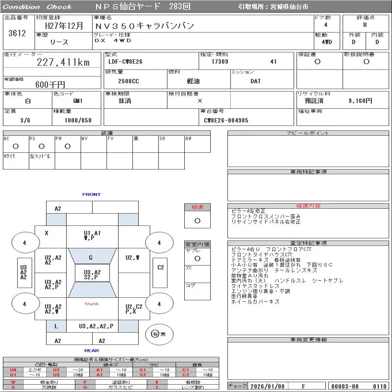 Nissan CARAVAN VAN с аукциона Японии NPS Sendai Nyusatsu лот № 3612
