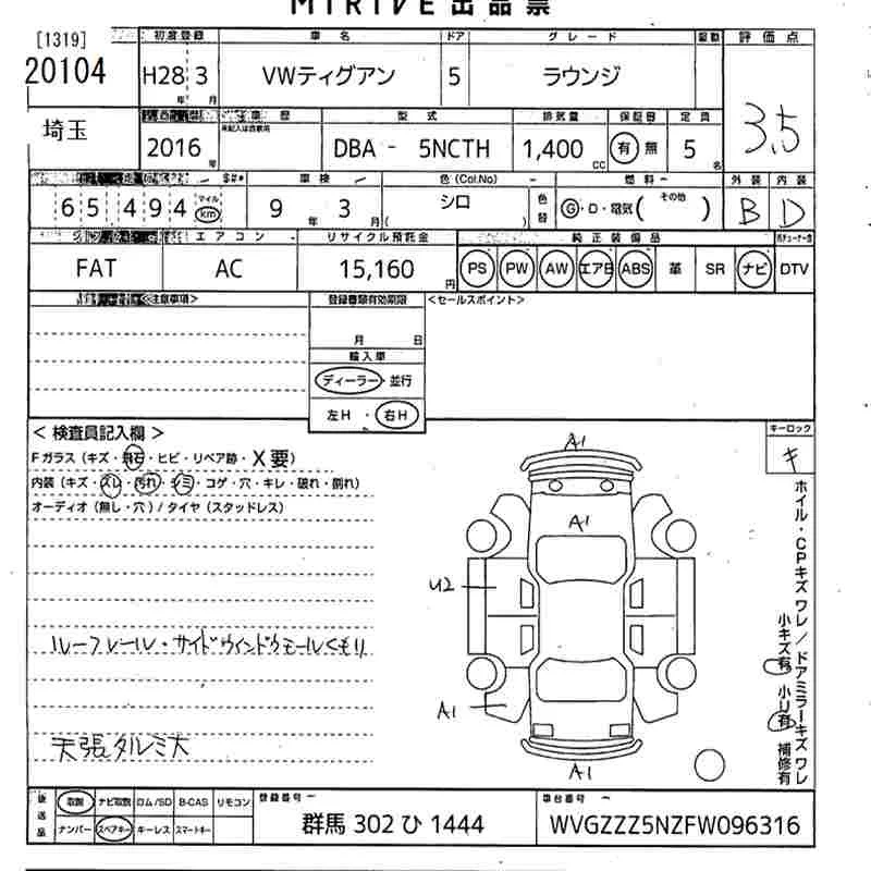 Volkswagen TIGUAN с аукциона Японии MIRIVE Saitama лот № 20104