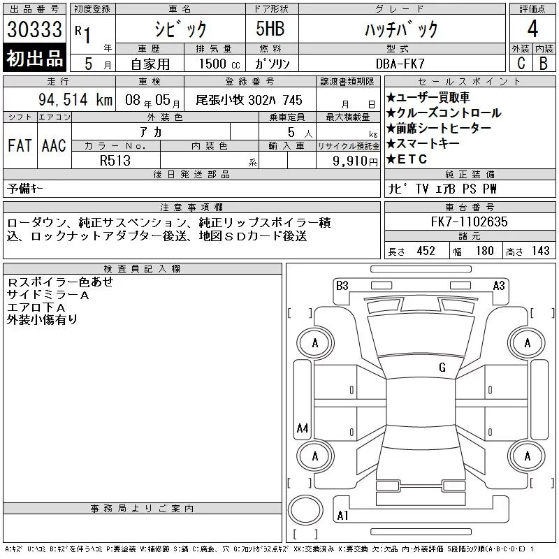 Honda CIVIC с аукциона Японии CAA Chubu лот № 30333