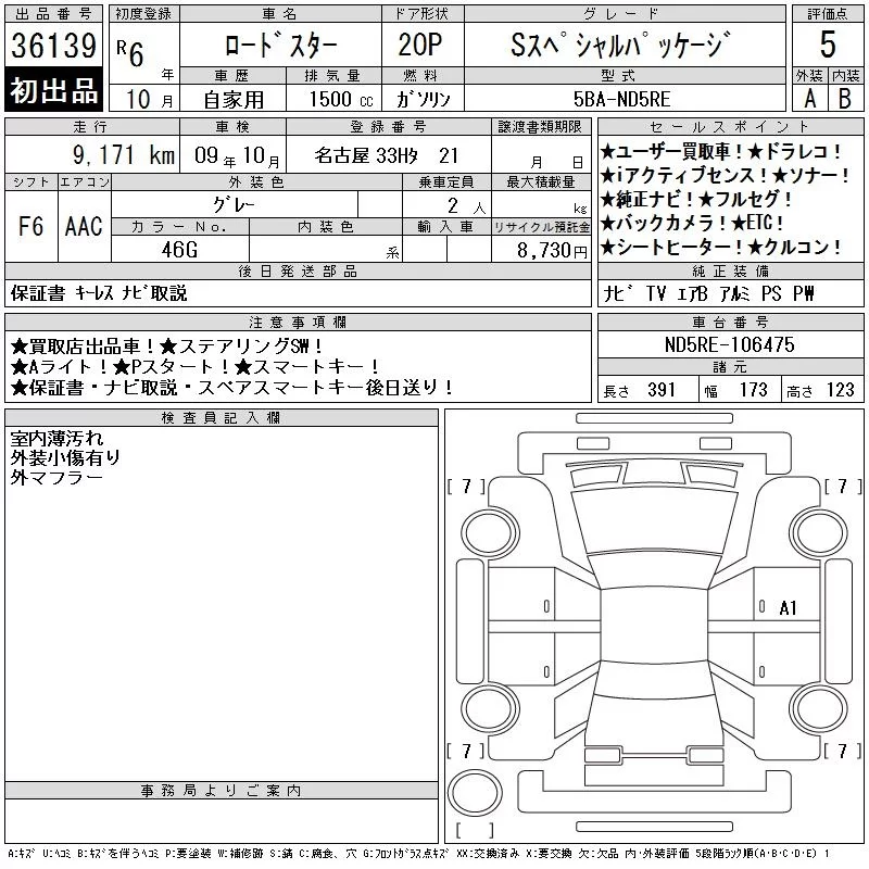 Mazda ROADSTER с аукциона Японии CAA Chubu лот № 36139