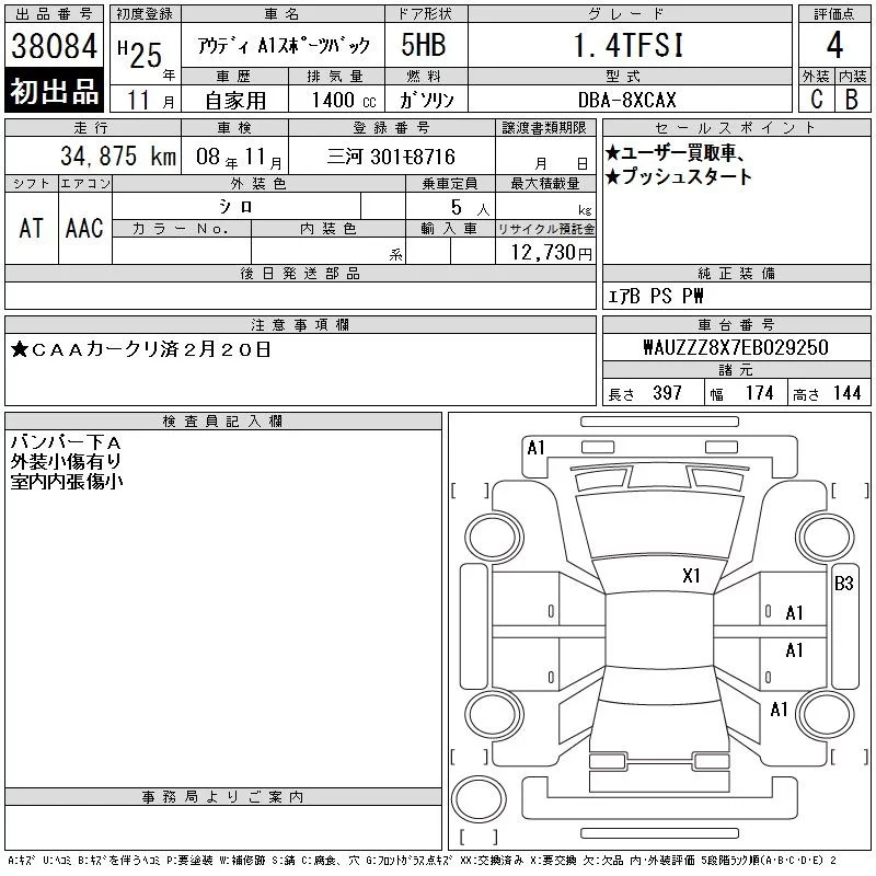 Audi A1 с аукциона Японии CAA Chubu лот № 38084