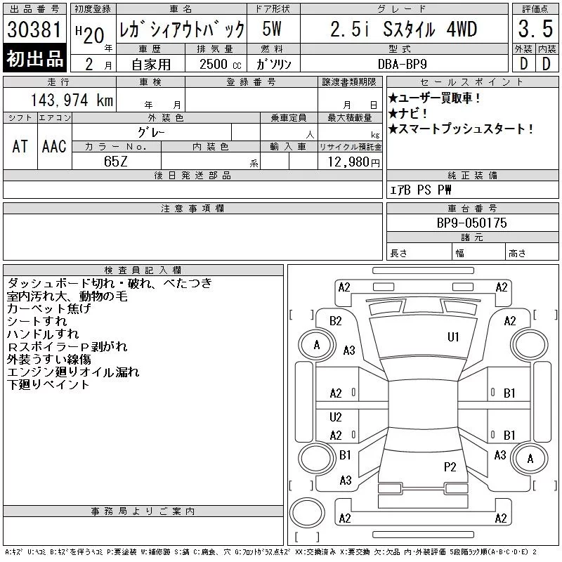 Subaru LEGACY OUTBACK с аукциона Японии CAA Chubu лот № 30381