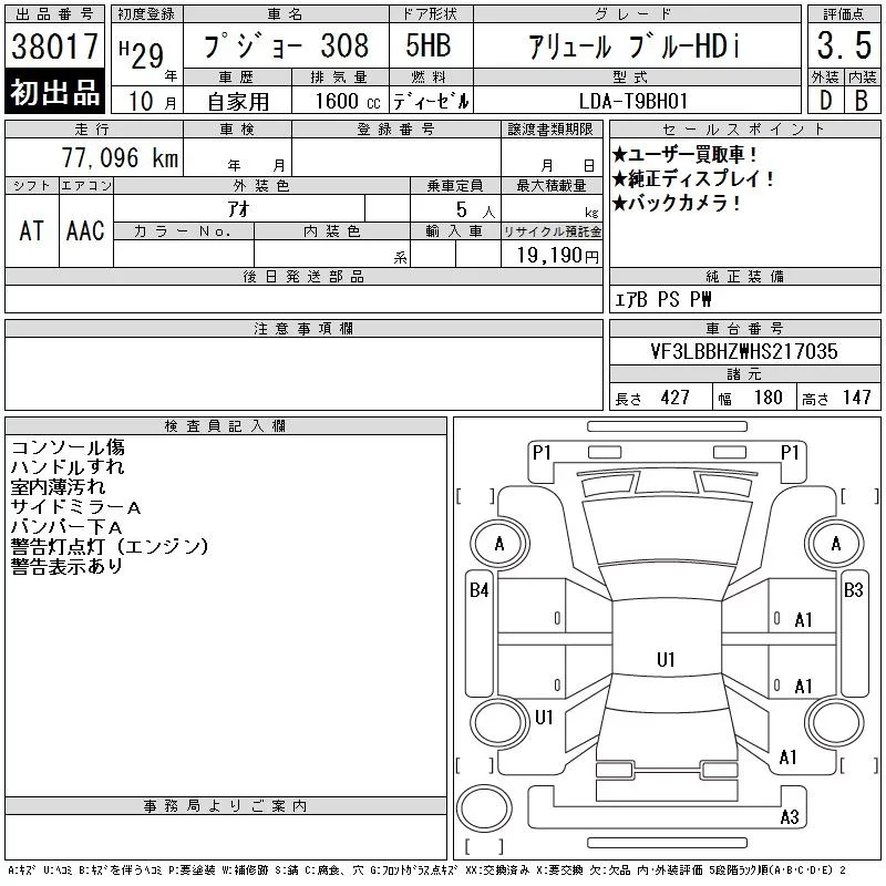 Peugeot 308 с аукциона Японии CAA Chubu лот № 38017