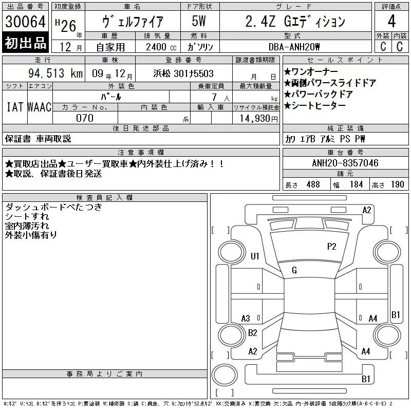 Toyota VELLFIRE с аукциона Японии CAA Chubu лот № 30064