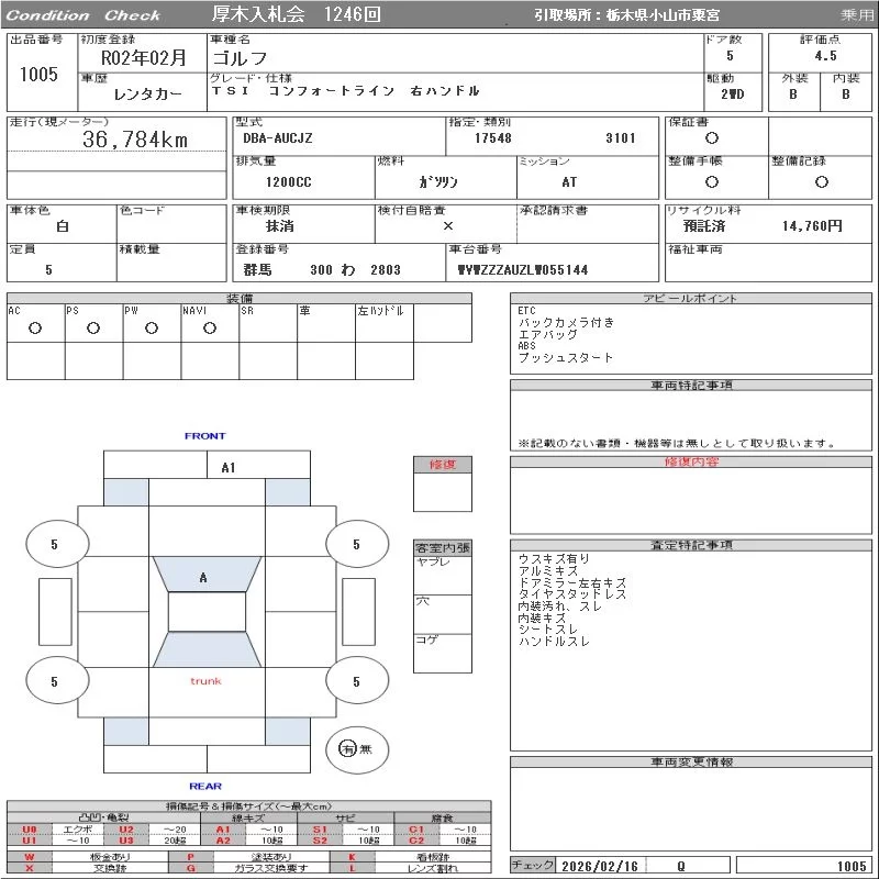 Volkswagen GOLF с аукциона Японии ORIX Atsugi Nyusatsu лот № 1005