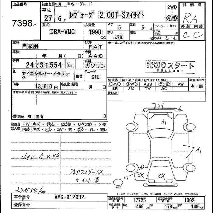 Subaru LEVORG с аукциона Японии JU Fukushima лот № 7398
