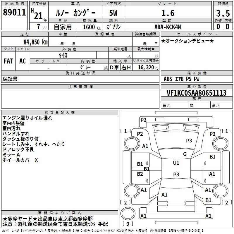 Renault KANGOO с аукциона Японии TAA Kanto лот № 89011