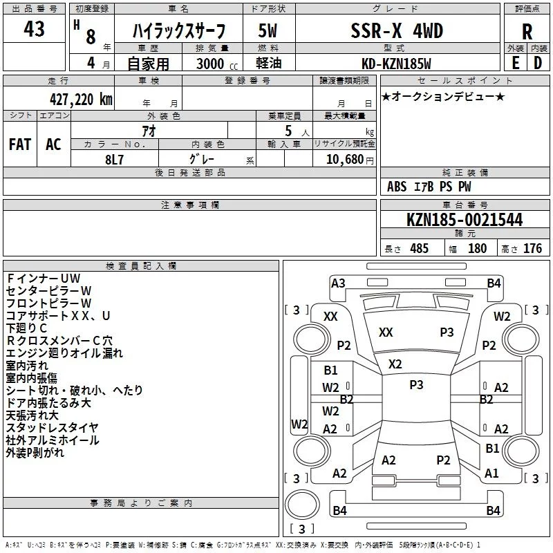 Toyota HILUX SURF с аукциона Японии TAA Tohoku лот № 43