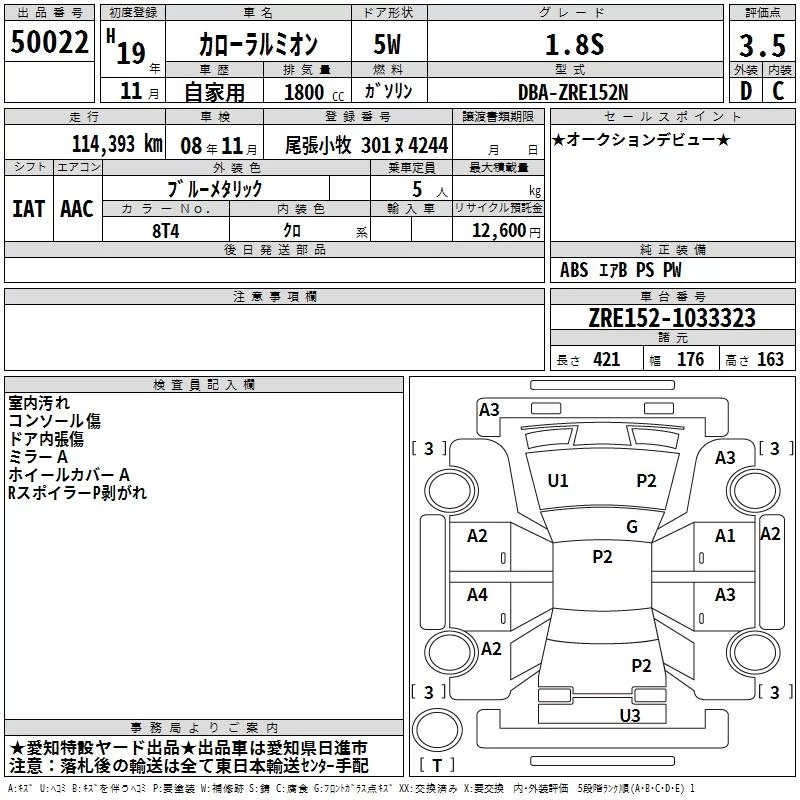 Toyota COROLLA RUMION с аукциона Японии TAA Chubu лот № 50022