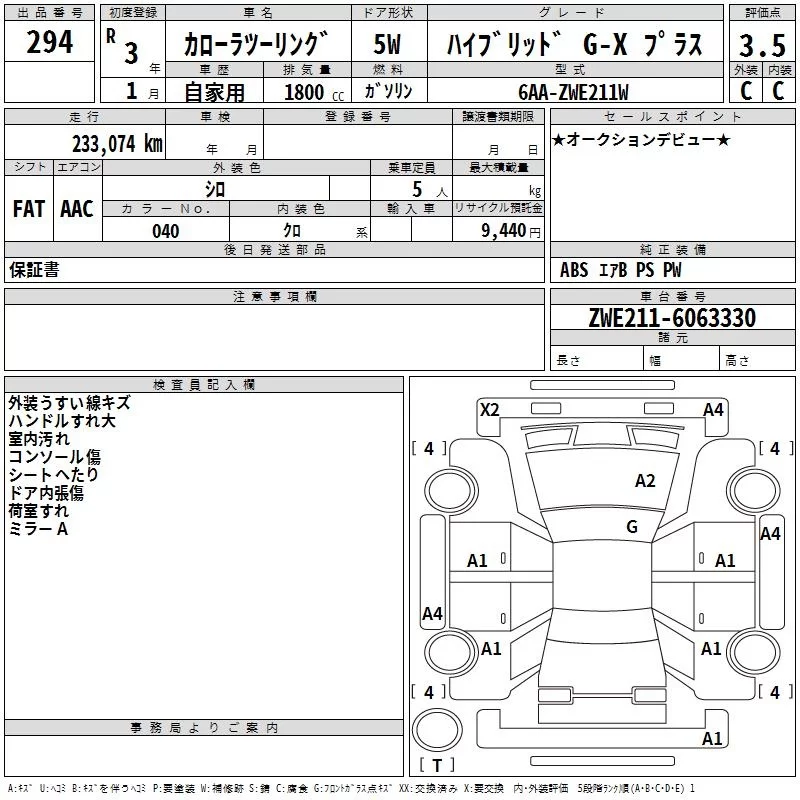 Toyota COROLLA TOURING с аукциона Японии TAA Chubu лот № 294
