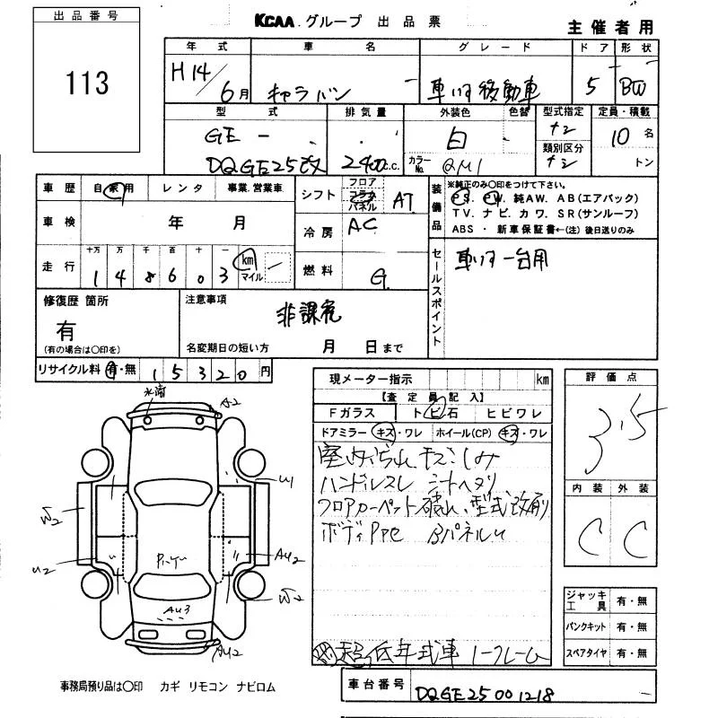Nissan CARAVAN BUS с аукциона Японии KCAA Fukuoka лот № 113