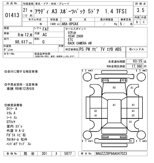 Audi A3 с аукциона Японии ARAI Oyama лот № 1413