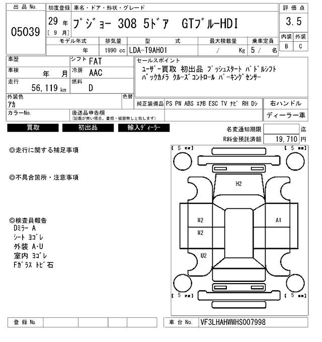 Peugeot 308 с аукциона Японии ARAI Bayside лот № 5039