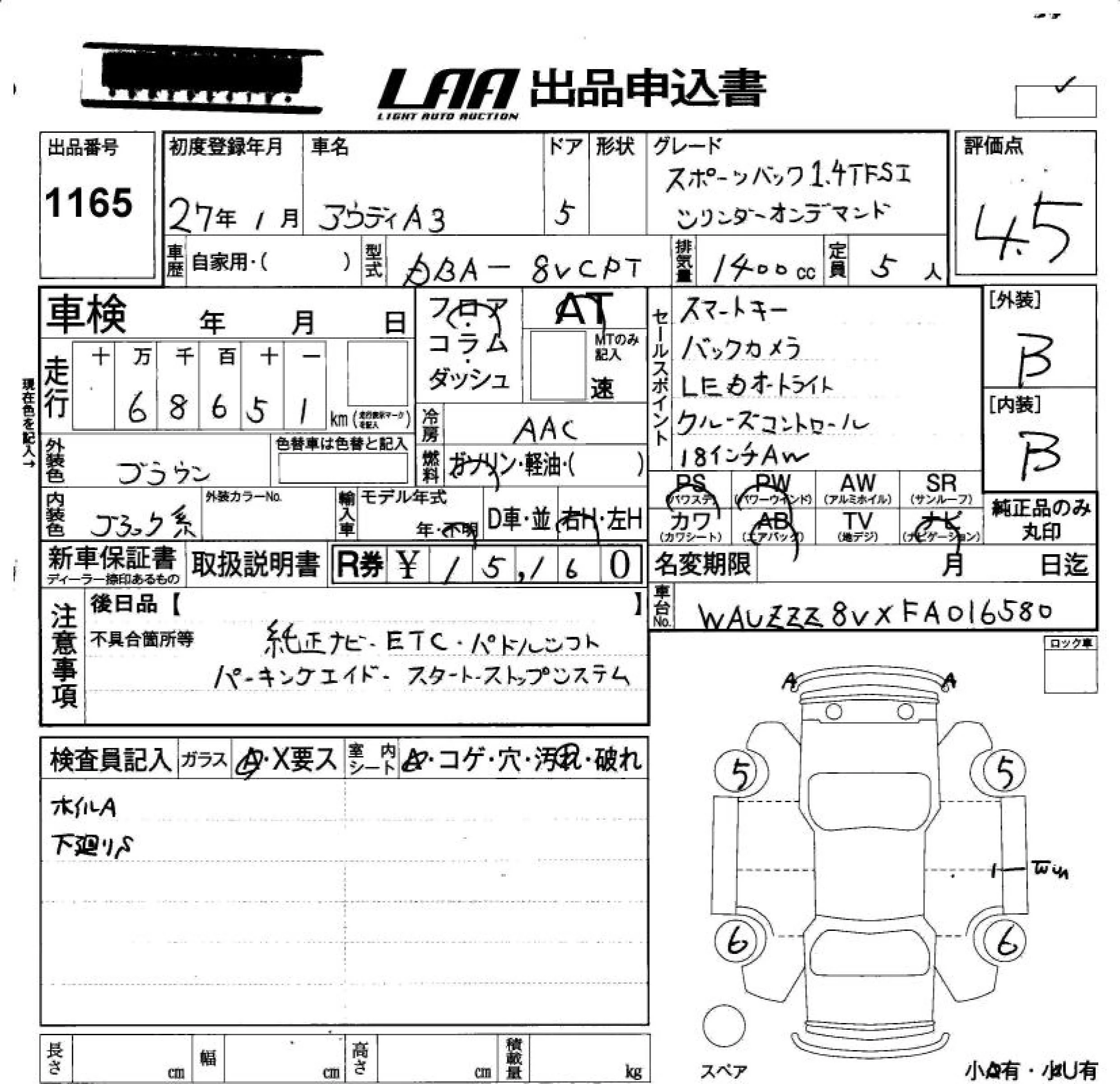 Audi A3 с аукциона Японии LAA Okayama лот № 1165