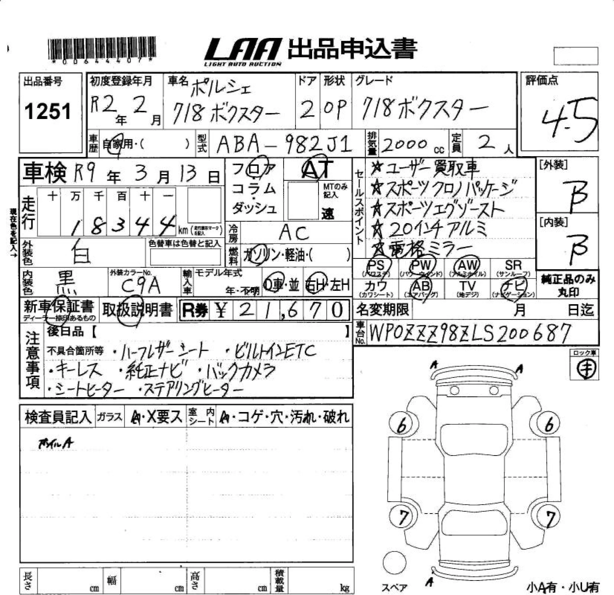 Porsche Boxster с аукциона Японии LAA Okayama лот № 1251