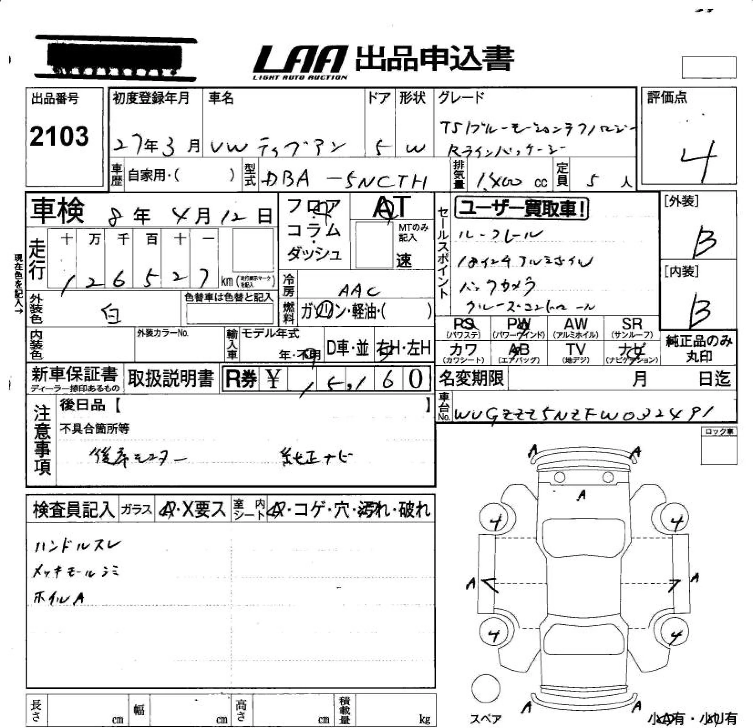 Volkswagen TIGUAN с аукциона Японии LAA Okayama лот № 2103