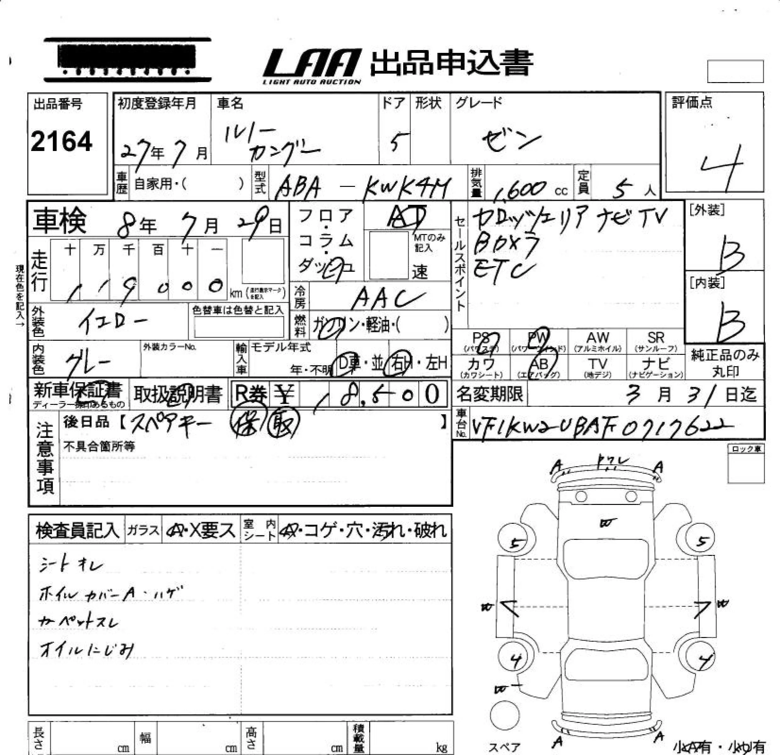 Renault KANGOO с аукциона Японии LAA Okayama лот № 2164