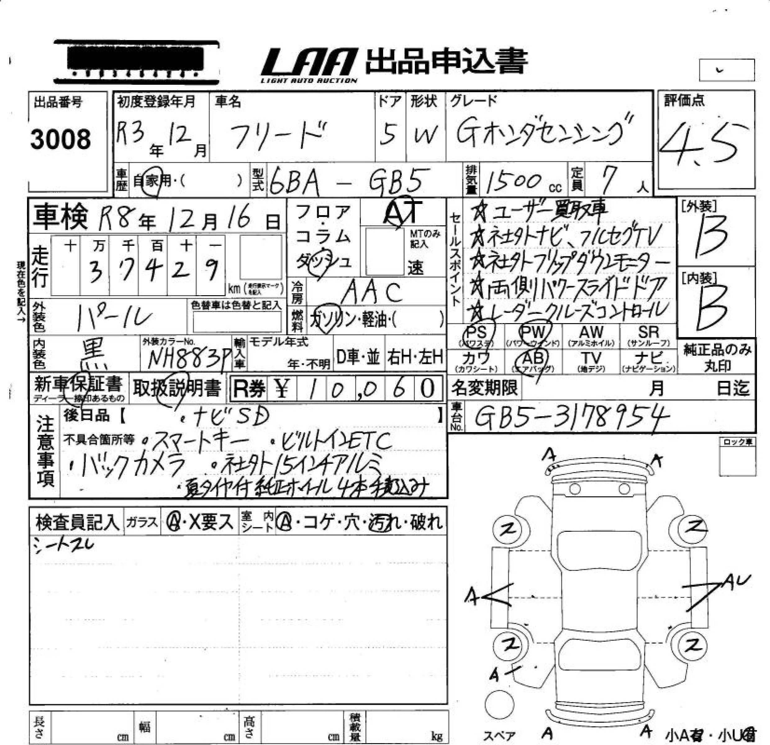 Honda FREED с аукциона Японии LAA Okayama лот № 3008