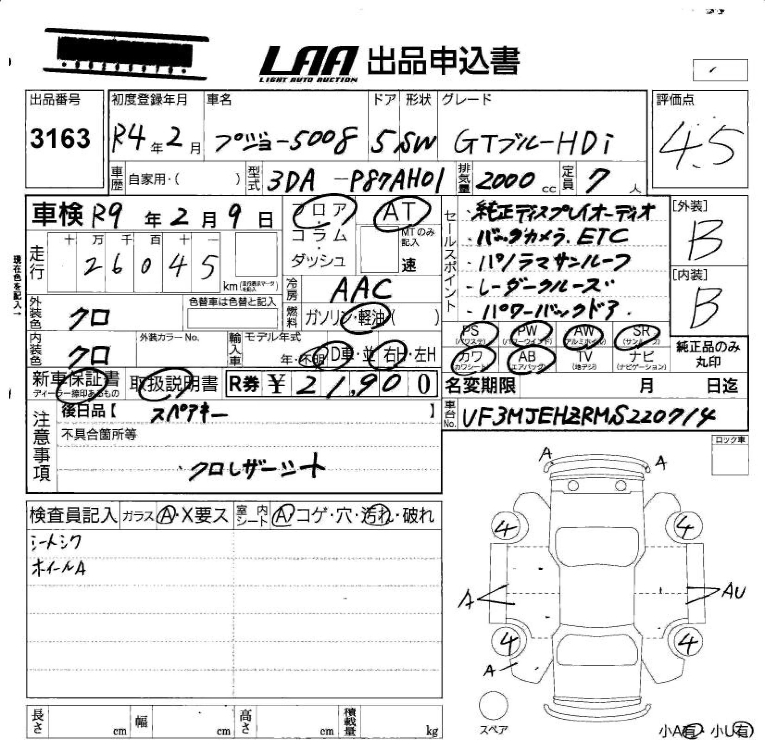 Peugeot 5008 с аукциона Японии LAA Okayama лот № 3163