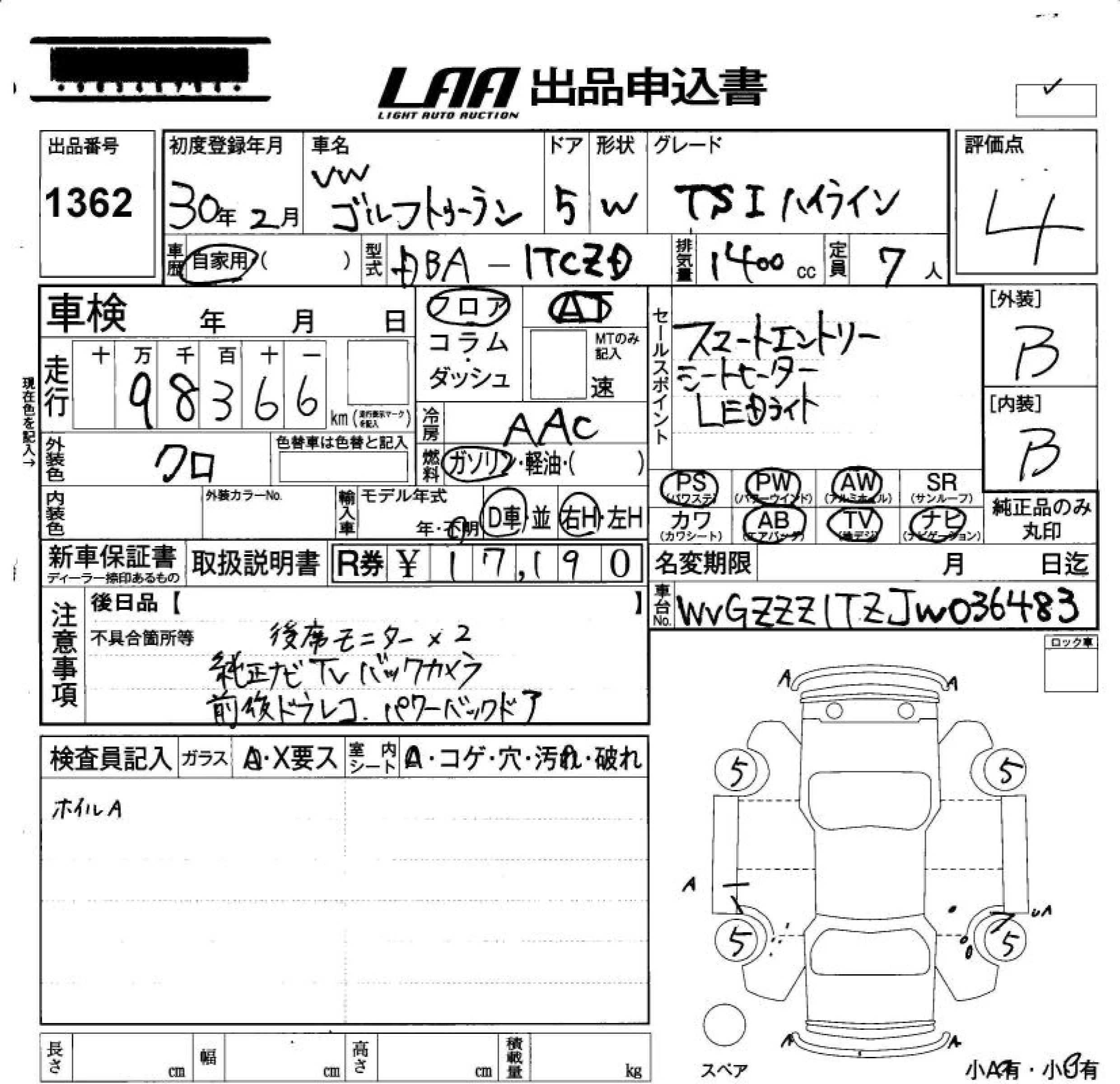 Volkswagen GOLF TOURAN с аукциона Японии LAA Okayama лот № 1362