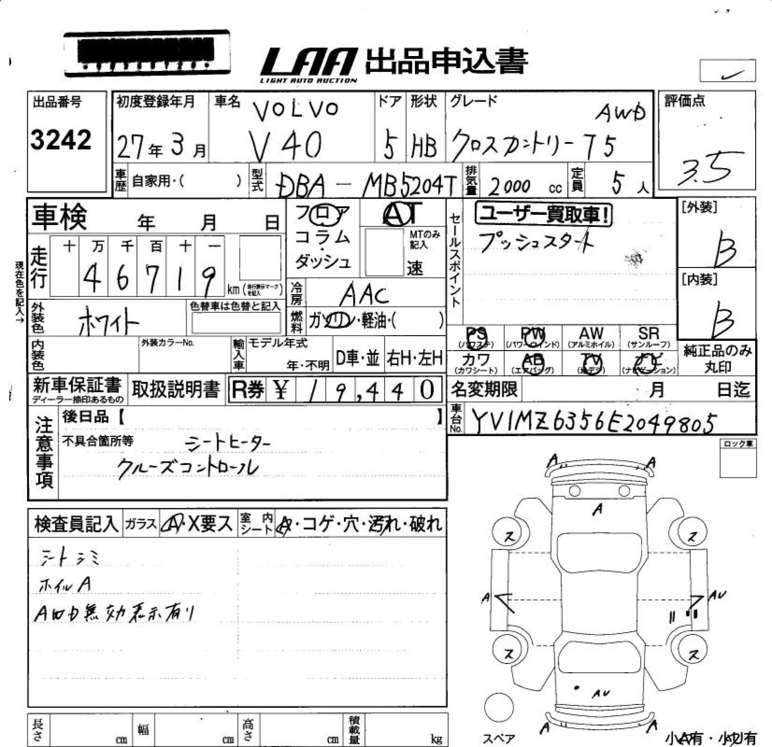 Volvo V40 с аукциона Японии LAA Okayama лот № 3242