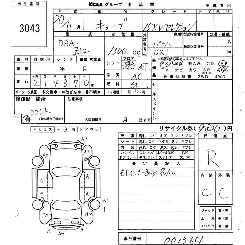 Nissan CUBE с аукциона Японии KCAA Yamaguchi лот № 3043