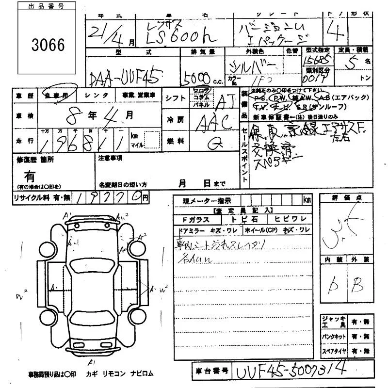 Lexus LS с аукциона Японии KCAA Yamaguchi лот № 3066