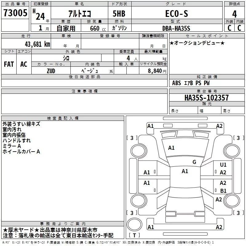 Suzuki ALTO ECO с аукциона Японии TAA Yokohama лот № 73005