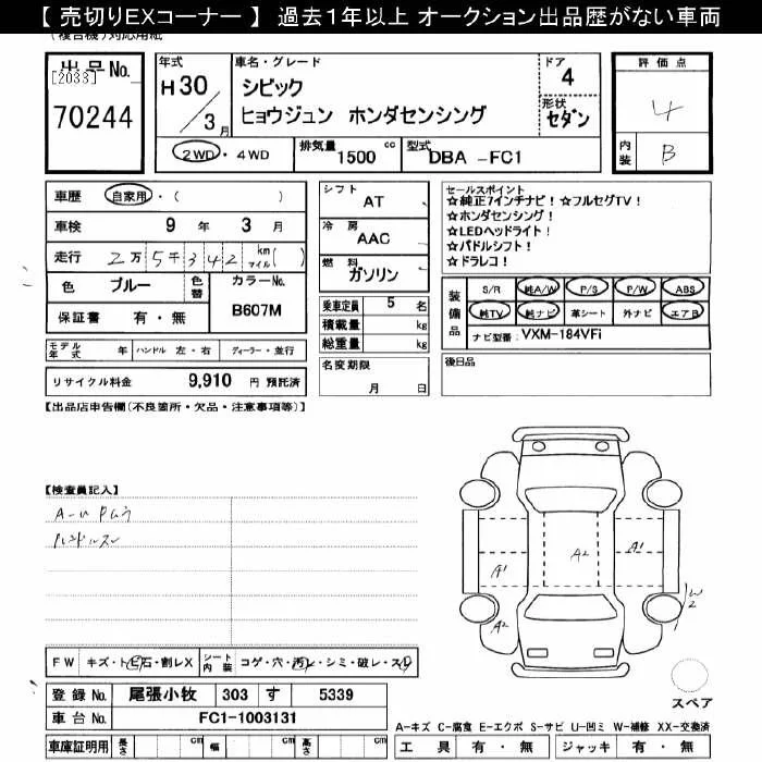 Honda CIVIC с аукциона Японии JU Gifu лот № 70244