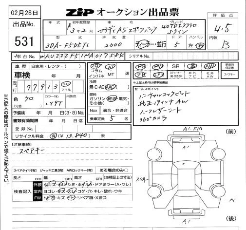 Audi A5 с аукциона Японии ZIP Tokyo лот № 531