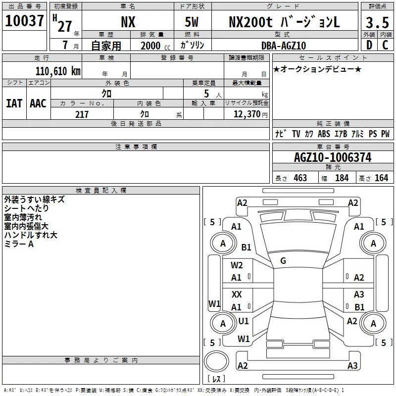 Lexus NX с аукциона Японии TAA Kinki лот № 10037