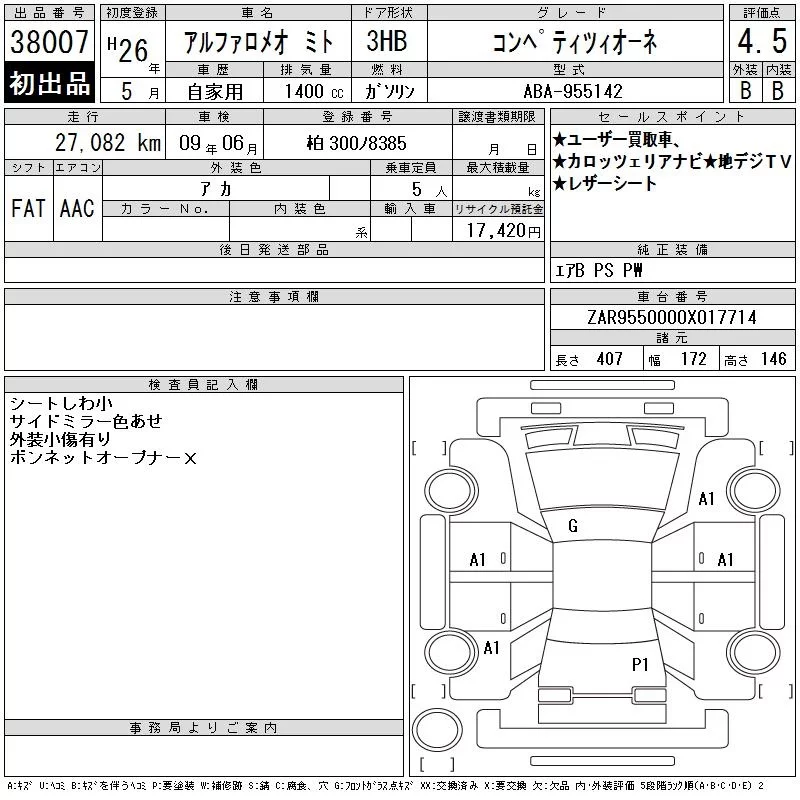 Alfa Romeo MiTo с аукциона Японии CAA Tokyo лот № 38007