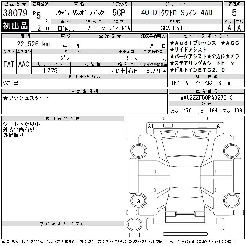Audi A5 с аукциона Японии CAA Tokyo лот № 38079