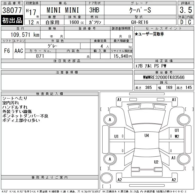 BMW MINI с аукциона Японии CAA Tokyo лот № 38077