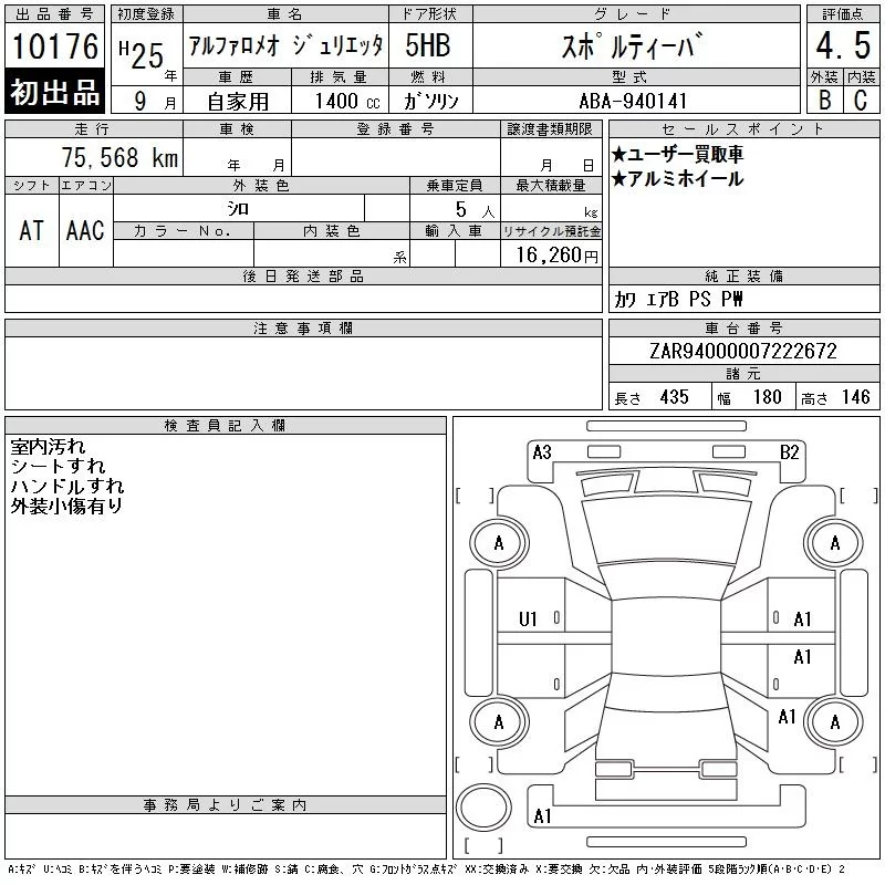 Alfa Romeo Giulietta с аукциона Японии CAA Tokyo лот № 10176