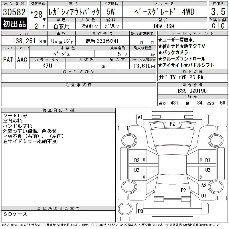 Subaru LEGACY OUTBACK с аукциона Японии CAA Tokyo лот № 30582