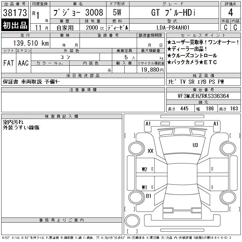 Peugeot 3008 с аукциона Японии CAA Tokyo лот № 38173