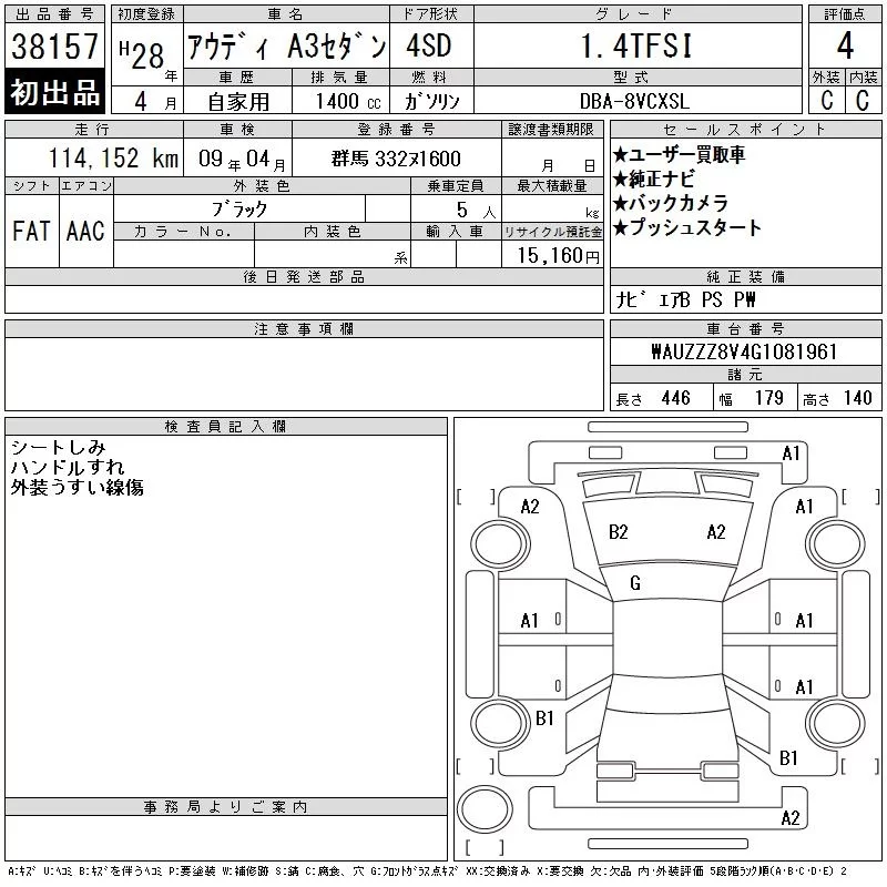 Audi A3 с аукциона Японии CAA Tokyo лот № 38157