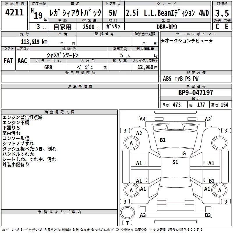 Subaru LEGACY OUTBACK с аукциона Японии TAA Shikoku лот № 4211