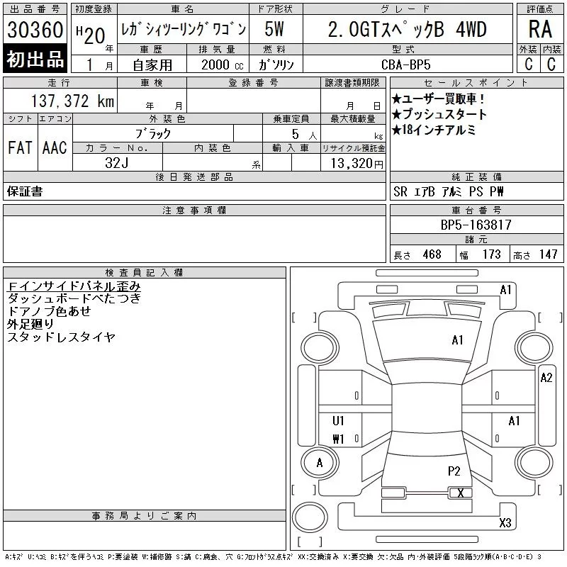 Subaru LEGACY с аукциона Японии CAA Gifu лот № 30360