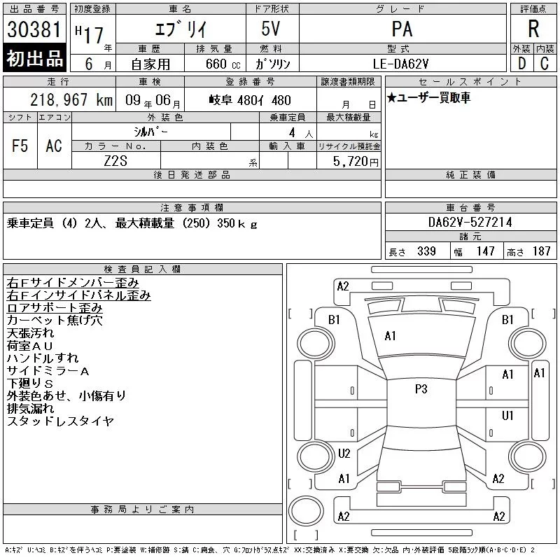 Suzuki EVERY с аукциона Японии CAA Gifu лот № 30381