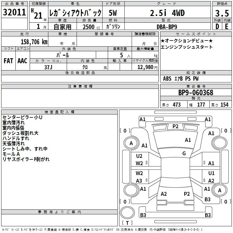 Subaru LEGACY OUTBACK с аукциона Японии TAA Minami Kyushu лот № 32011