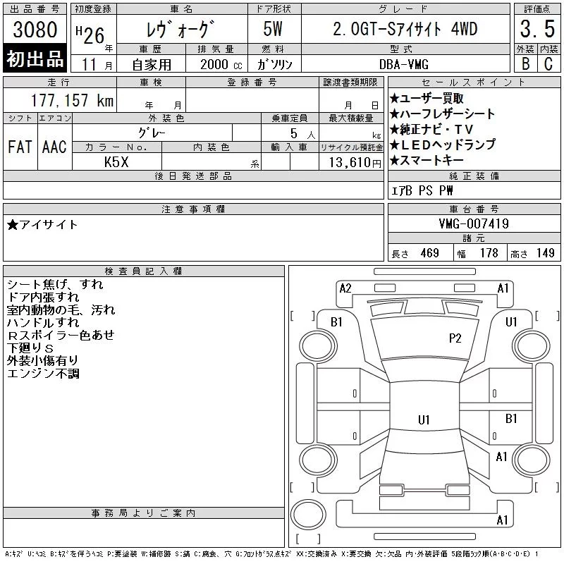 Subaru LEVORG с аукциона Японии CAA Tohoku лот № 3080