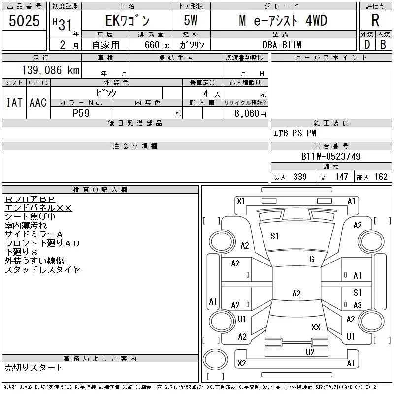 Mitsubishi EK WAGON с аукциона Японии CAA Tohoku лот № 5025