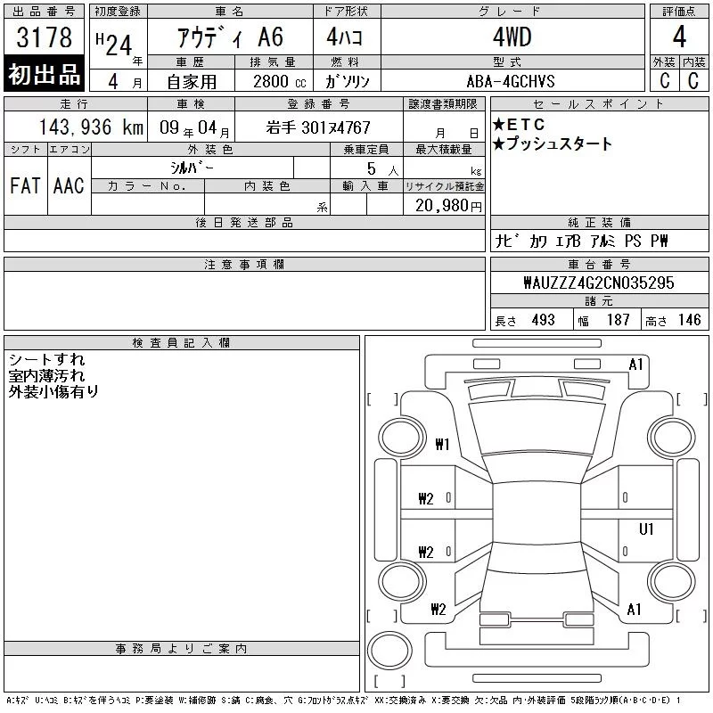 Audi A6 с аукциона Японии CAA Tohoku лот № 3178